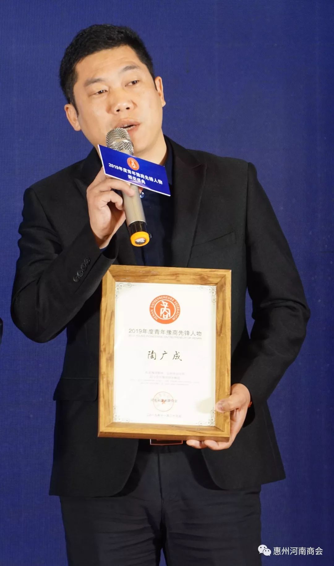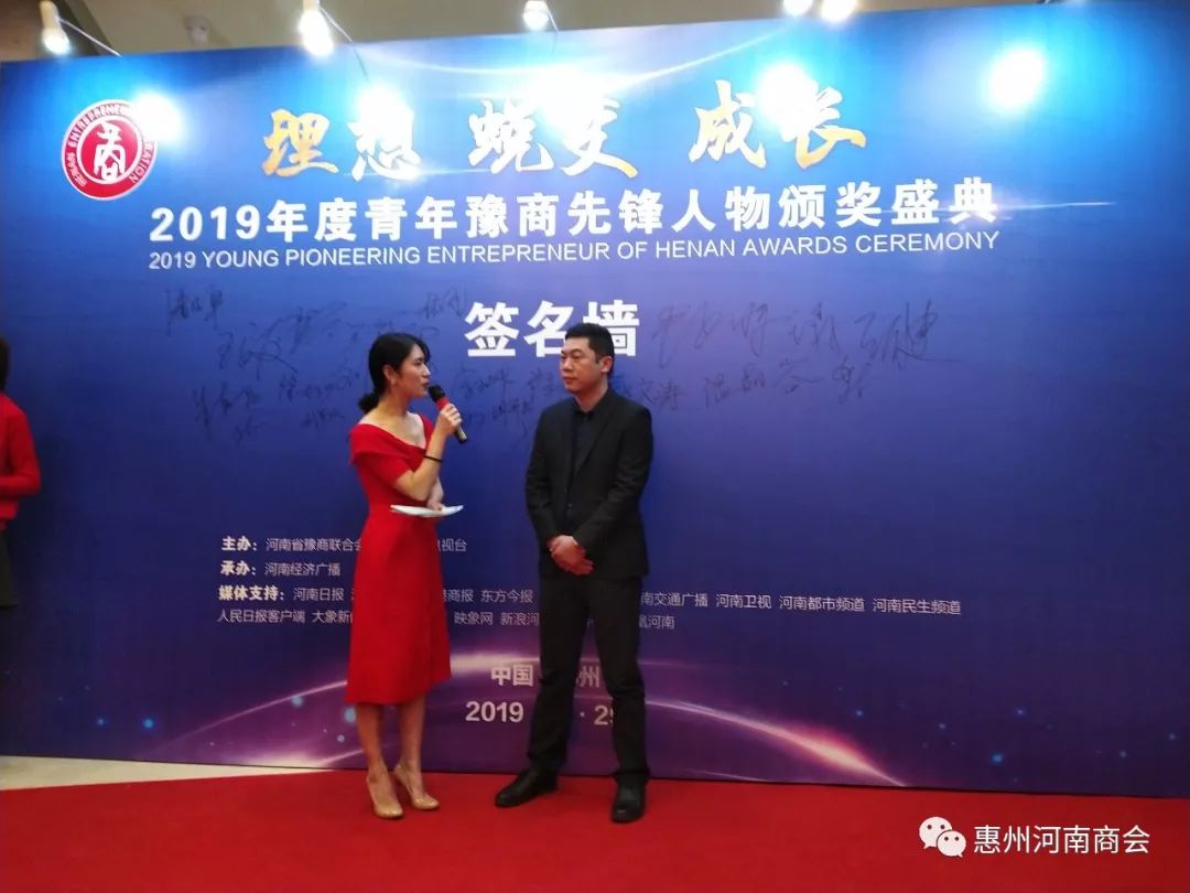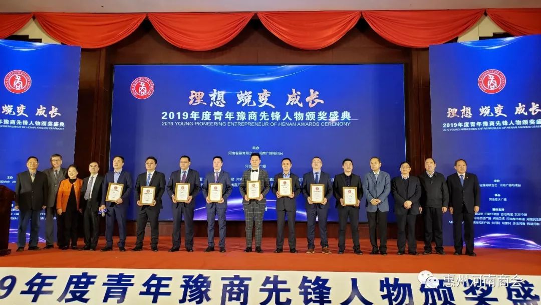 传承豫商精神,弘扬商业文明。11月29日,由河南省豫商联合会、河南广播电视台主办,河南经济广播承办的2019年度青年豫商先锋人物颁奖盛典在郑州隆重举行,300位来自各行各业的青年企业家相约中原、共襄盛举,共同聆听创业领袖的商界感悟,见证三地青年豫商先锋人物的荣誉加冕。惠州市河南商会副会长、广东绿点环境发展有限公司董事长陶广成荣获2019年度青年豫商先锋人物,惠州市河南商会党支部书记兼秘书长王有钱一起陪同参加。
